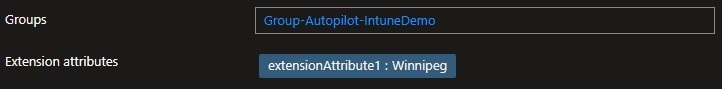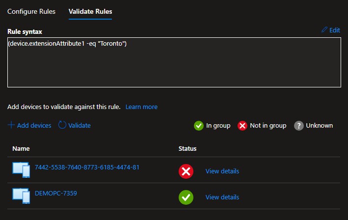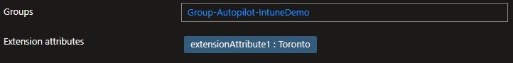 Here is an example of the Toronto query and validating the membership of the group based on the extensionAttribute1 set for each device earlier. Don’t mind the device with the serial-number name – it had just been imported into Autopilot and was being deployed.