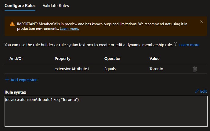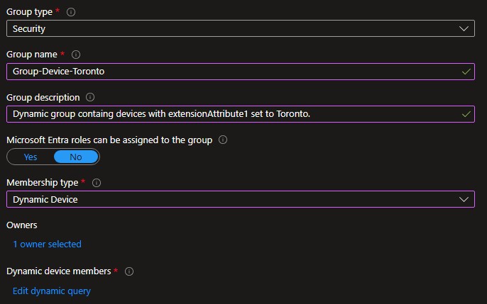 2. Create the Dynamic Groups: Create one Dynamic Groups for Toronto devices and another for Winnipeg devices.