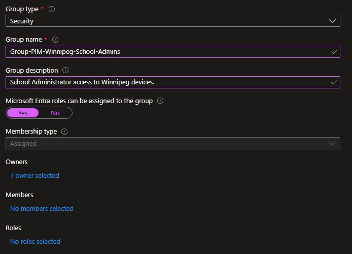 Be sure to enable “Microsoft Entra roles can be assigned to the group”. Although right now we are going to link these groups to Intune roles, we may link them to Entra roles in the future.