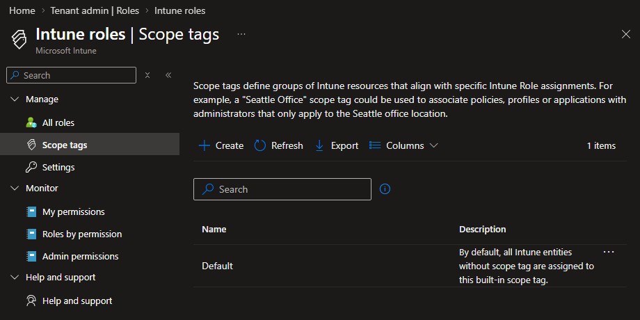 In Intune, navigate to Tenant Administration > Roles > Scope Tags: