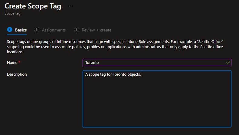 First we will create “Toronto” and “Winnipeg” Scope Tags. a Scope Tag is essentially a label you that can be applied to objects in Intune (like devices, apps, or policies) to control who is allowed to see and manage them. For better or for worse, Intune likes to default open when it comes to scope tags. i.e. No Scope tag or “Default” lets users see everything.