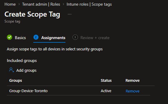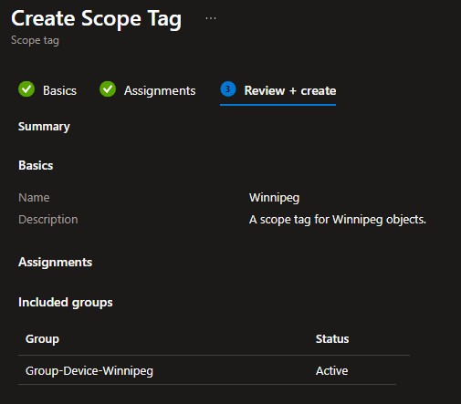 Review and create the Scope Tag. It will now be assigned to all objects in that group automatically. Repeat for the Winnipeg group.