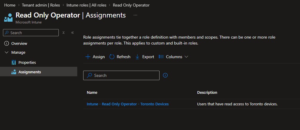 4. Configure the Scoped Role Assignment: Link the technicians to the Toronto and Winnipeg device groups using two different Intune roles and leveraging Scope Tags.