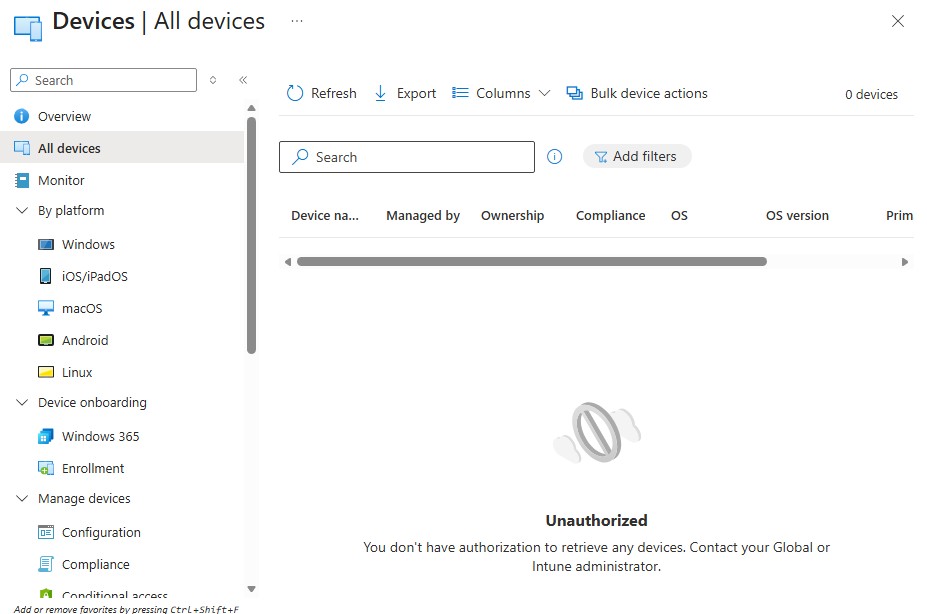 Signing in with an “Intune Administrator” that does not yet have any roles (or dark mode) activated…
